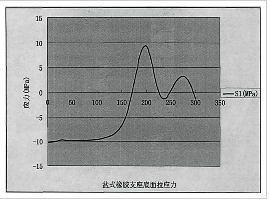 下支座的有限元分析。計(jì)算的結(jié)果曲線和試驗(yàn)結(jié)果曲線的趨勢(shì)一樣,數(shù)值有差別,但是相差不大。在有限元計(jì)算時(shí),支座底面采用剛性約束,模擬支座在墩臺(tái)上,忽略支座的鍋底變形的作用,支座底面面拉應(yīng)力如圖3一8所示:由圖3一8可見,最大壓應(yīng)力在支座中心部位。為一10MPa,最大拉應(yīng)力出現(xiàn)在橡膠與盆環(huán)交界處。為9.328lMPa。支座的壓應(yīng)力在半徑小于120IUm情況下變化一直很小,在 150mID處變化很大,呈極具上升,這主要是因?yàn)橄鹉z的側(cè)向力推缸盆底部所引起的。在接近Zooluln處應(yīng)力值達(dá)到最大,是因?yàn)橄鹉z向側(cè)向運(yùn)動(dòng)受到盆環(huán)約束,盆環(huán)相當(dāng)于一個(gè)簡(jiǎn)單的懸臂梁。在橡膠體橫向力作用下盆環(huán)與鋼盆底部交接處的應(yīng)力相應(yīng)的會(huì)很大。橡膠承受壓力,壓力小于橡膠的抗壓極限25MPa。鋼盆底部與盆環(huán)處受拉應(yīng)力作用