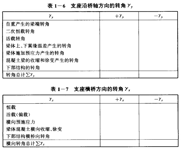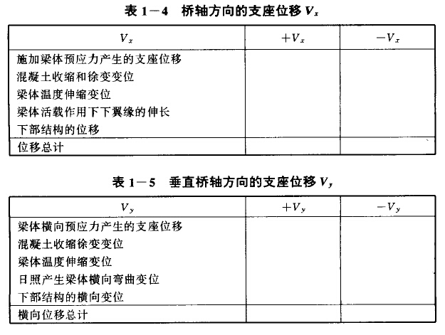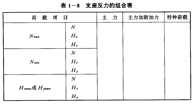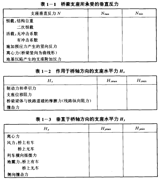 為了正確地選擇與設計橋梁支座,必須對支座所承受的反力、位移和轉角進行全面的分析。橋梁支座承受的垂直反力和水平反力可列表表示,見表1—1一表1—3。