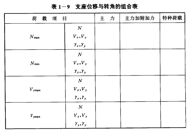 通道以上各項列表計算,就可以對支座的反力、位移和轉角有了全面的廣解.然后可分別根據(jù)主力、主力加附加力和持種荷載幾種情況,對支座的反力、位移和轉角進行組合,以提供可靠的支座設計參數(shù)。支座反力、位移和轉角的組合見表1—8、表1—9。