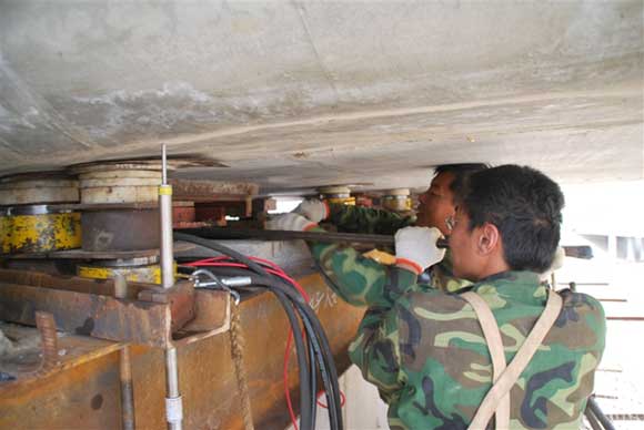 按設定的位置在橋臺上依次安裝千斤頂和鋼墊板。鋼墊板直接放置在千斤頂球形墊板上,視間隙的大小取用不同厚度的墊板,要求墊板與千斤頂同心。