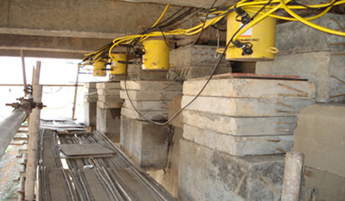 1、保證頂升時(shí)梁體不會(huì)因局部應(yīng)力突然增加而受到破壞。在頂升梁體時(shí),梁體會(huì)出現(xiàn)因局部應(yīng)力的突然增加而造成應(yīng)力集中的現(xiàn)象,而當(dāng)取消梁體頂升時(shí),應(yīng)力會(huì)突然得到釋放,這樣一來,梁體的薄弱環(huán)節(jié)會(huì)因?yàn)槭芰Φ淖兓斐蓪?duì)梁體的破壞。針對(duì)這種現(xiàn)象,在進(jìn)行梁體頂升時(shí),我們要進(jìn)行精密的計(jì)算,來控制總的頂升量。當(dāng)采取分級(jí)頂升的方法時(shí),總的頂升會(huì)通過幾級(jí)小的頂升來分別完成,因此需要注意的是當(dāng)每一級(jí)提升量到位后要用墊塊墊牢,然后才能對(duì)當(dāng)前級(jí)的千斤頂進(jìn)行卸載,在對(duì)橋梁支座采取頂升后靜止1個(gè)小時(shí),再進(jìn)入到下一級(jí)的頂升作業(yè),并逐步依次進(jìn)行。