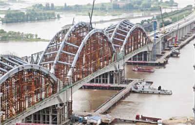 6月27日,經(jīng)過(guò)4年多建設(shè),由中國(guó)鐵建二十二局集團(tuán)施工的哈齊客運(yùn)專(zhuān)線(xiàn)松花江特大橋主橋合龍。一座大橋上四條鐵路線(xiàn)并行,使它成為國(guó)內(nèi)首例整體四線(xiàn)剛性系桿拱橋。