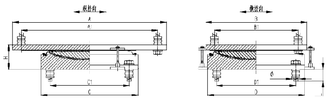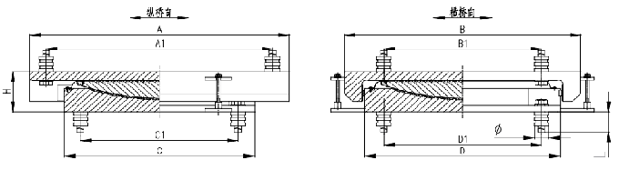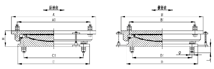 球型支座的水平位移是由上(支座)滑板與中座板上的平面四氟板之間的滑動來實現(xiàn)的。另外,通過在上座板上設(shè)置導(dǎo)向板(槽)或?qū)颦h(huán)來約束支座的單向或多向位移,可以制成單向活動球型支座和固定球型支座。