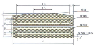 圖中:δ-支座厚度;h-球冠高度;d-支座直徑;δ0-單層圓鋼板厚度;δ1-中間層橡膠片厚度;δ2-聚四氟乙烯厚度;其中ΦA(chǔ)≈1/3ΦB