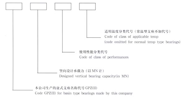 例如:GPZ(II)30SXF:表示GPZ(II)盆式橡膠支座中設(shè)計(jì)承載力為30MN的雙向(多向)活動(dòng)的耐寒型盆式支座。GPZ(II)50DX:表示GPZ(II)系列盆式支座中設(shè)計(jì)承載力為50MN的單向活動(dòng)的常溫型盆式支座。GPZ(II)80GD:表示GPZ(II)系列盆式橡膠支座中設(shè)計(jì)承載力為80MN的固定的常溫型盆式支座。